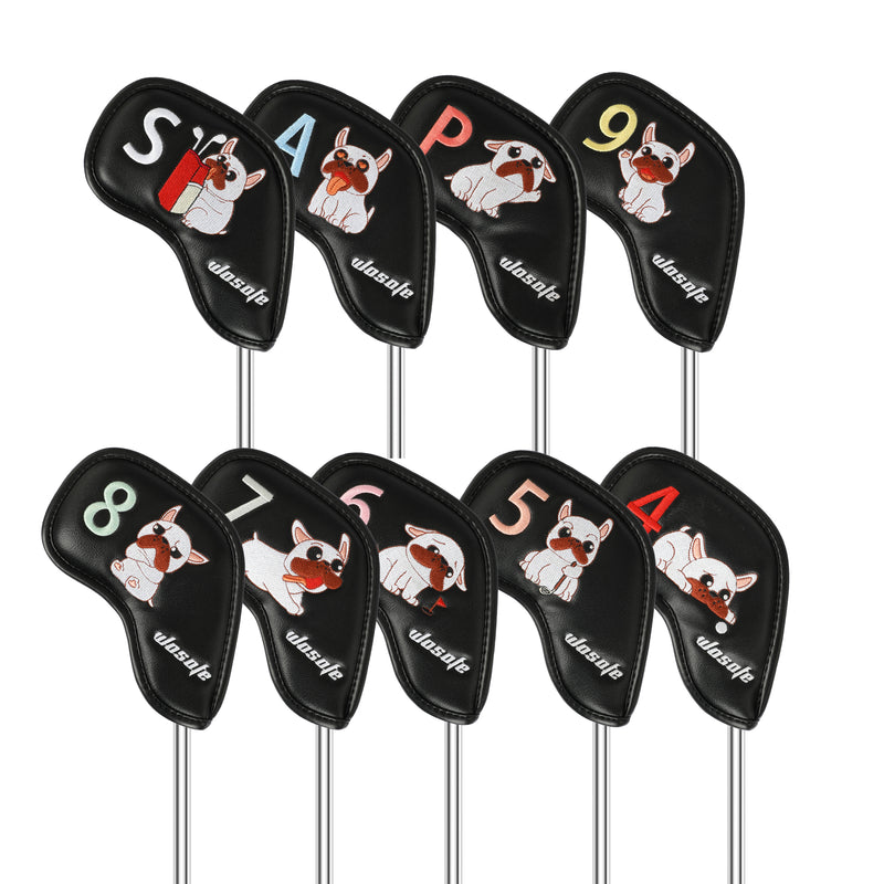High Quality PU Golf Headcover, Embroidered French Bulldog Design Iron Club Golf Head Cover Set 9pcs Waterproof Durable Effective Protection Club