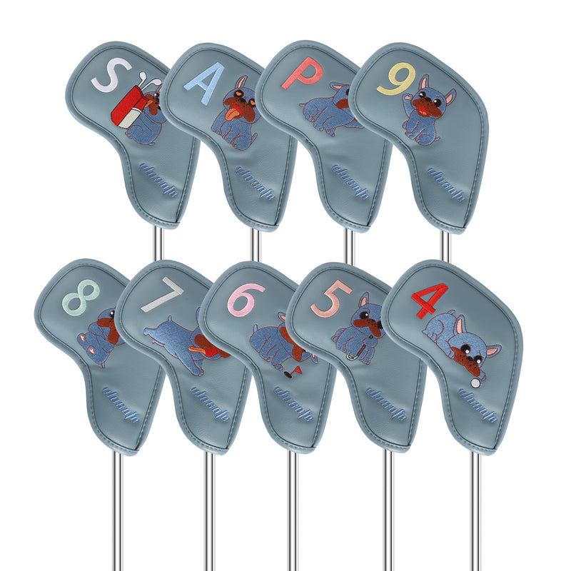 • High Quality PU Golf Headcover, Embroidered French Bulldog Design Iron Club Golf Head Cover Set 9pcs Waterproof Durable Effective Protection Club
